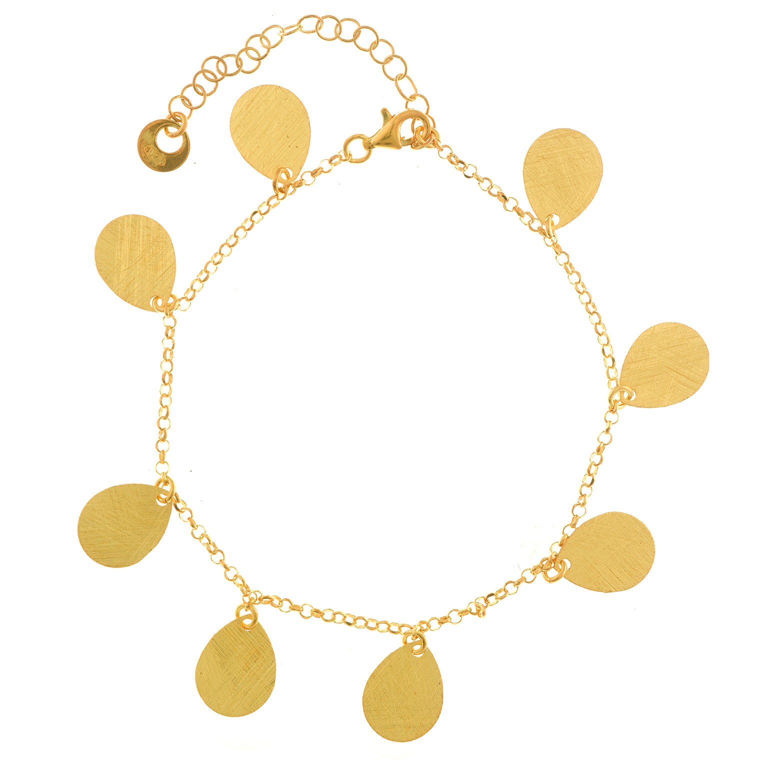 SERENA is designed with a fine gold-plated chain adorned with softly brushed pear-shaped drops that move freely with every step. The satin texture of each charm creates a gentle glow, offering a refined contrast against the delicate links.