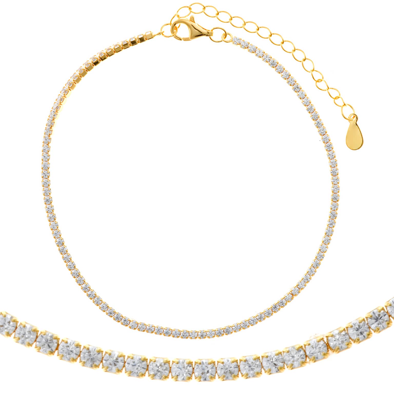A continuous line of brilliant-cut stones wrapped in gold-plated silver. Clean, fluid, and radiant—designed to move with the ankle and catch light at every step.