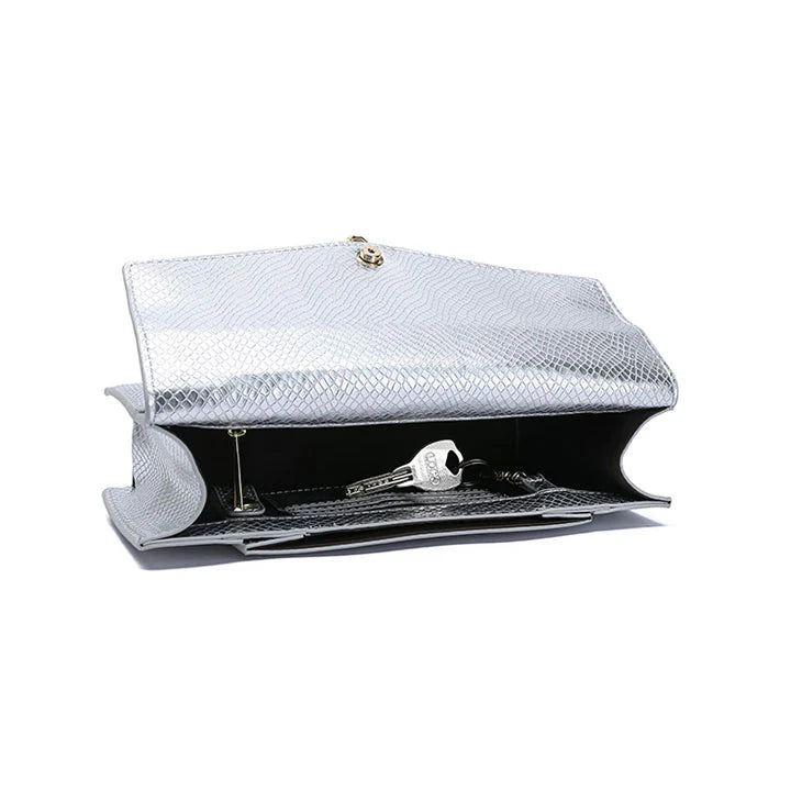 Composition: PU leather (snake-embossed) exterior with polyester lining, silver-tone metal hardware, chain and PU straps, and a polyester satin scarf.