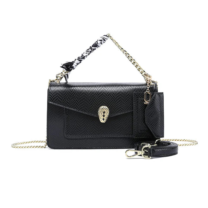 Composition: PU leather (snake-embossed) exterior with polyester lining, silver-tone metal hardware, chain and PU straps, and a polyester satin scarf.